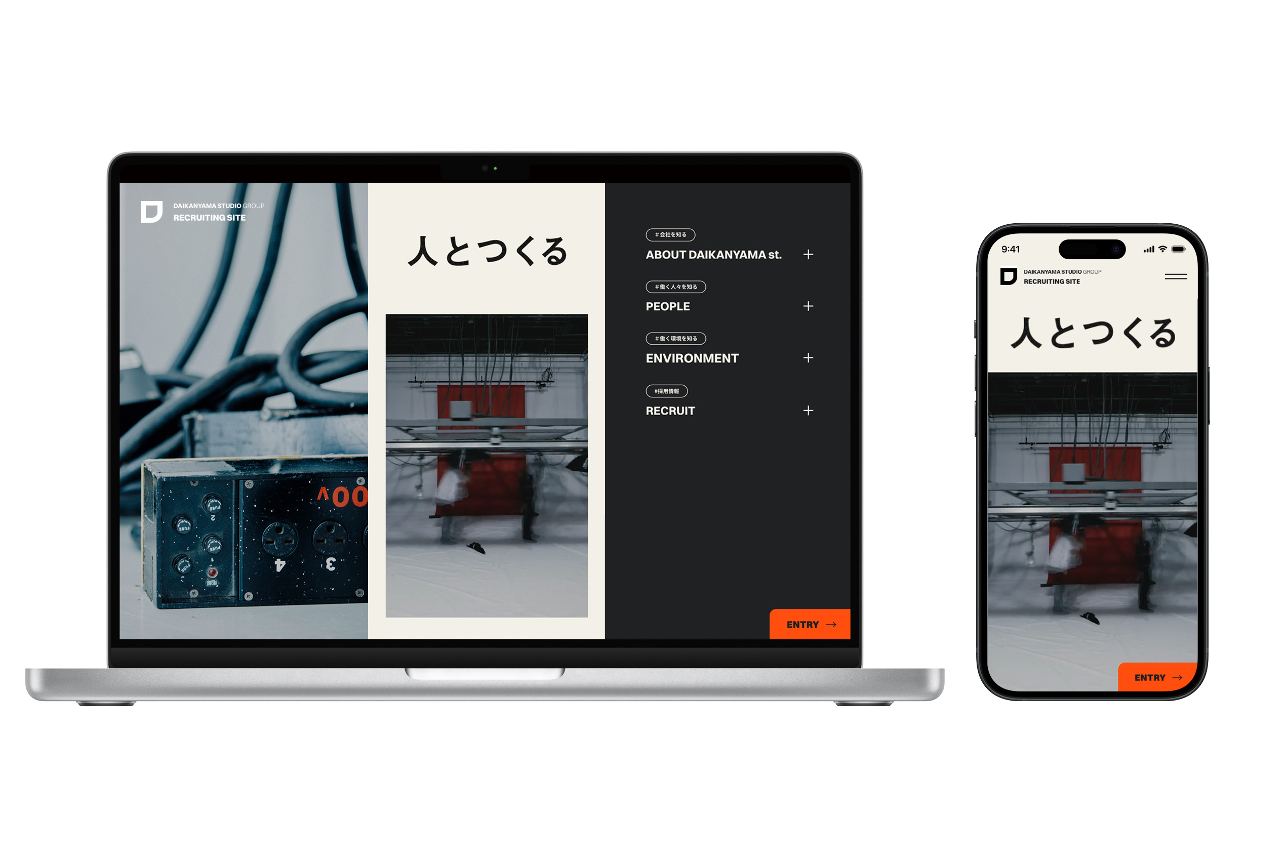 全体設計は、求職者の閲覧環境を考慮してモバイルファーストのデザインを採用。その上で、PCから閲覧しても見やすく機能的なデザインを実現しています。具体的には、中央にメインコンテンツ、左側にはスタジオ内の設備を写したソリッドなビジュアルを配置。右側にはサイトメニューを並べ、初めて訪れる方でも直感的に目的のページへアクセスできる、デザイン性とユーザビリティの両立を追求しました。