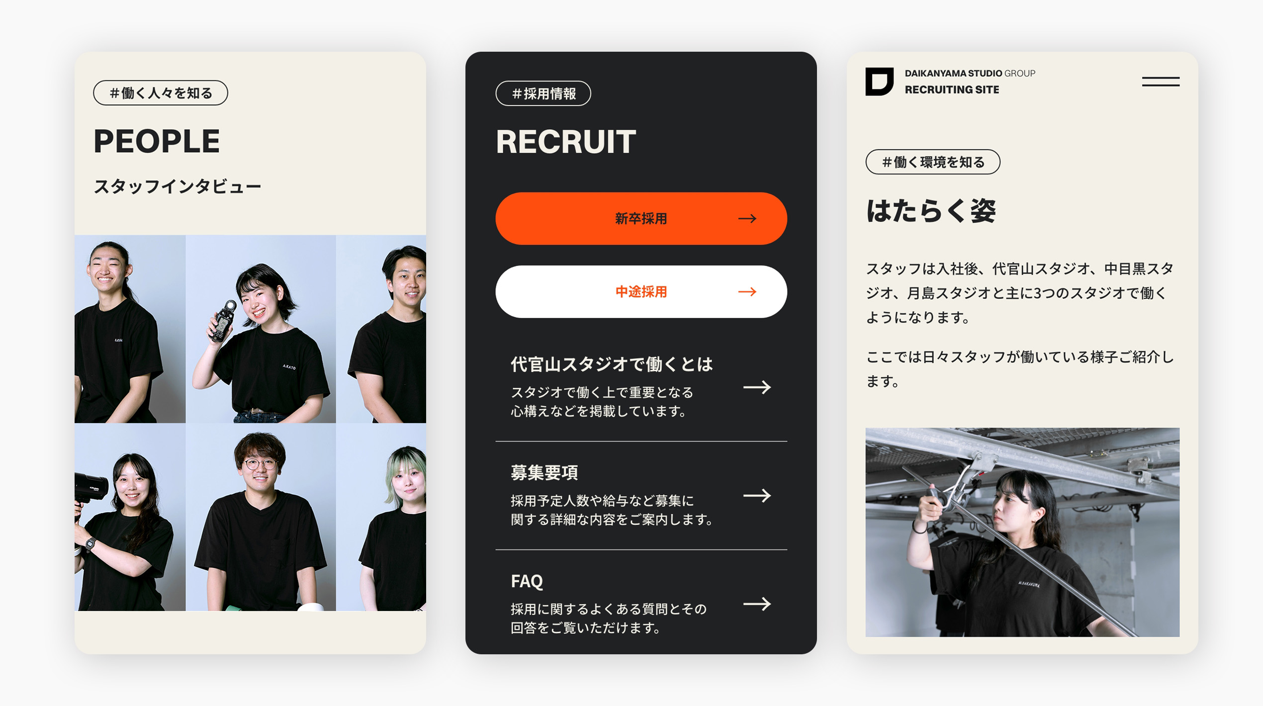 今回の制作にあたり、代官山スタジオグループで働くイメージをより具体的に伝えられるよう、スタッフの日頃の仕事内容や成長のステップなどが分かるコンテンツを作成し、求職者の理解が深まるサイトを目指しました。