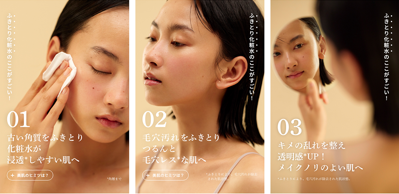 Youtubeやsnsで新規顧客の目に触れることになるプロモーション動画制作では、 使う瞬間の心地よさや、使うたびに透明感ある美しさが高まる印象を訴求。 ふきとり化粧水が女性だけのものではなく、男性やあらゆるジェンダーの方をも 美しくするものだと発信するため、 感性的な音楽やユニセックスなナレーションにもこだわりました。