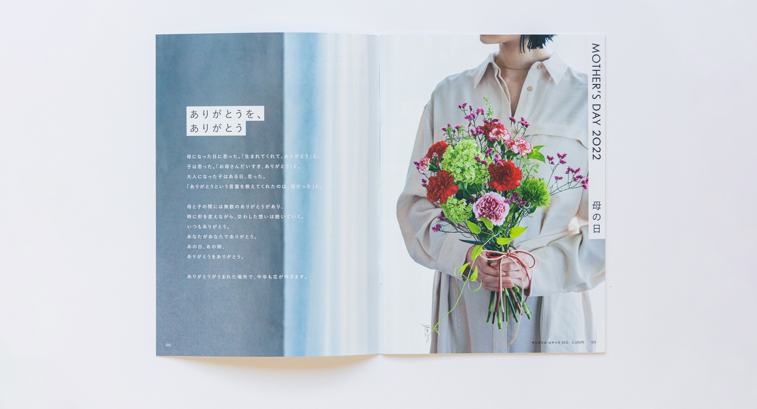 青山フラワーマーケットの2022母の日プロモーションに際して、コンセプトコピーとキービジュアル、 ショッパーやリーフレットなど店頭ツール一式を制作。
