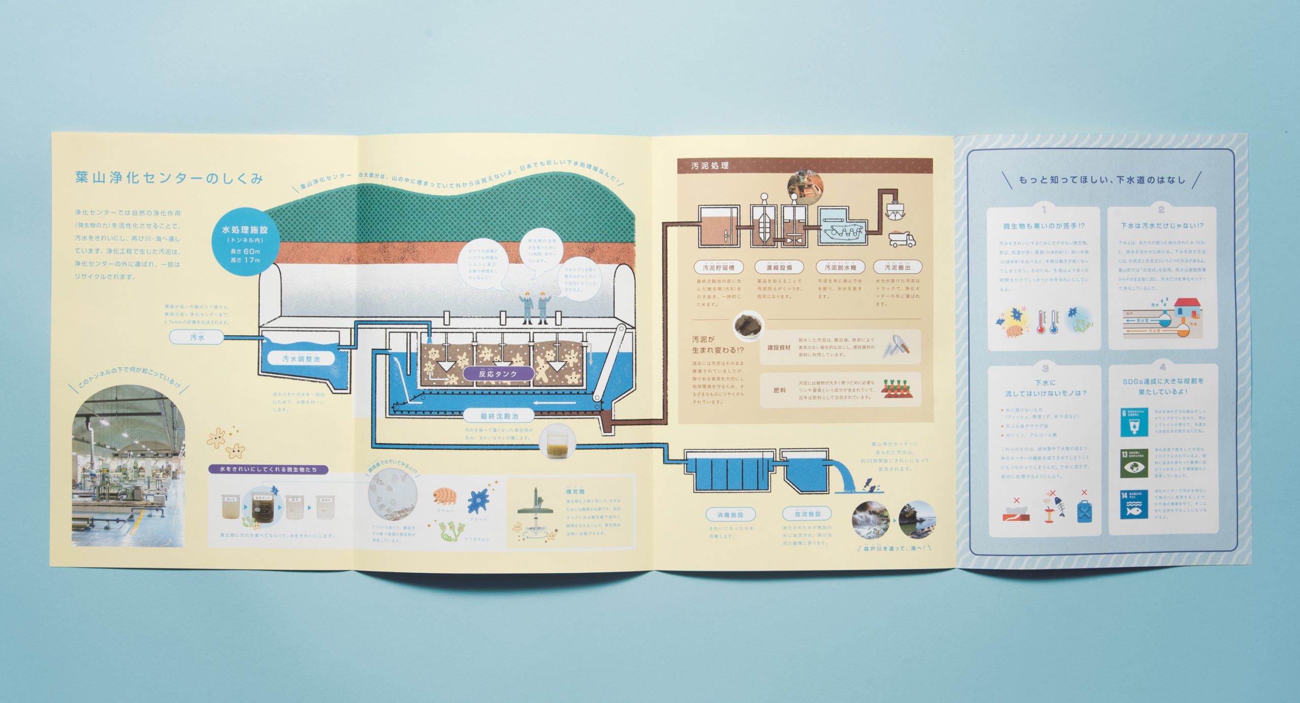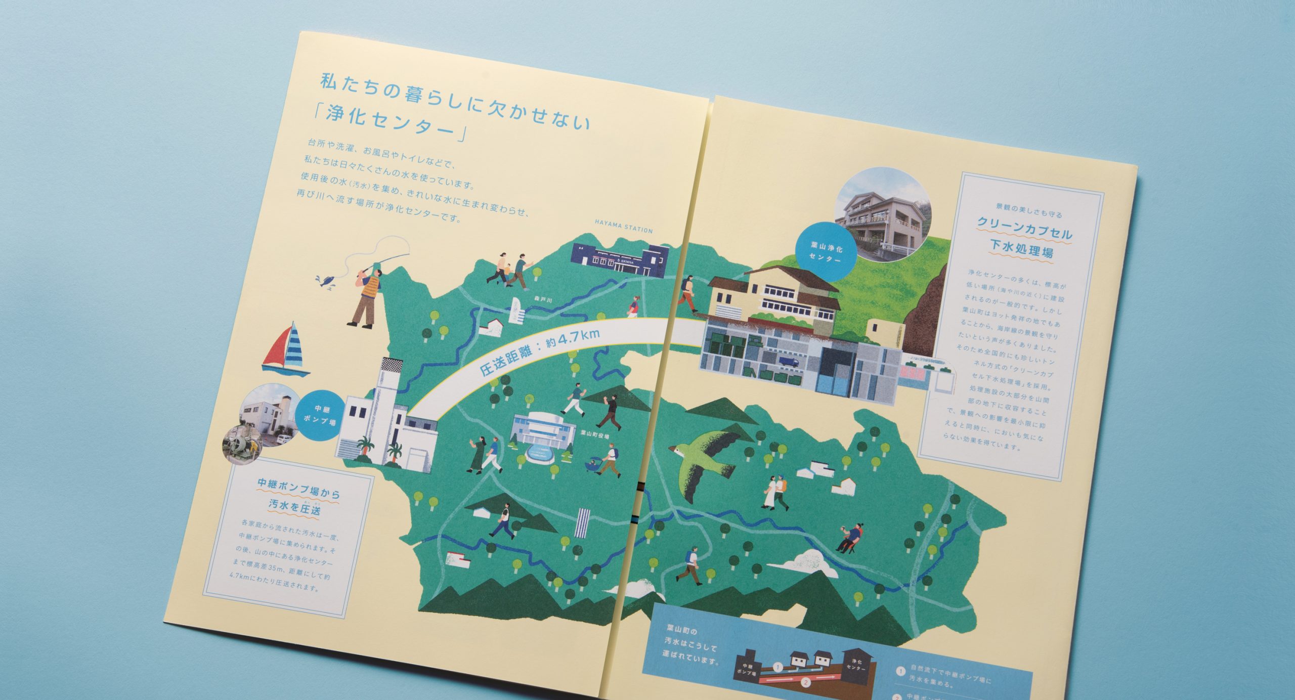 地元の小学生たちが校外学習で訪れる機会も多いとのことで、最もこだわったのはわかりやすさ。自分たちが水道などから流した水の、その後の話であること。どのような処理を施され、またキレイな水となって自然にかえっていくのかを、親しみを持って理解してもらえる構成のパンフレットにしました。