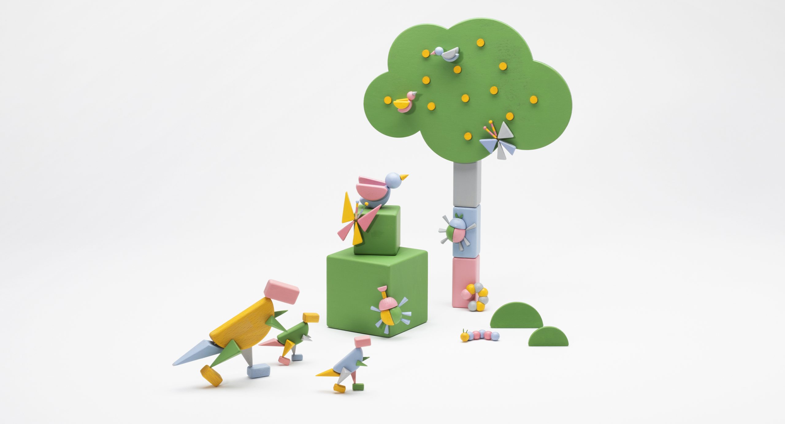 ロゴに使われていた「つみ木」を改めてブランドのシンボルとし、キービジュアルでは、オリジナルの「つみ木」の動物の親子たちをつくり、新しい「ALOBABY」の世界観をSOLIAさまと一緒に作り上げました。